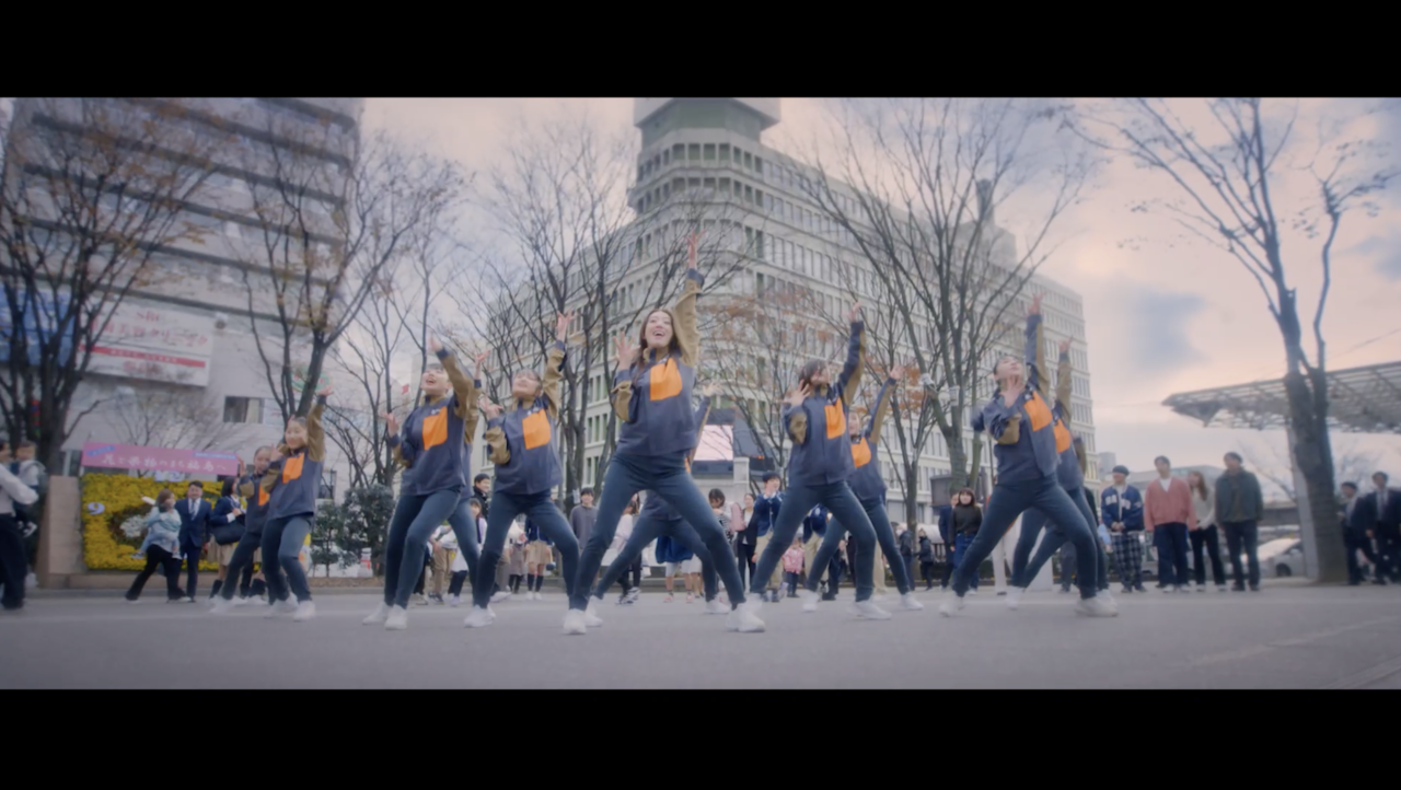 福島市ロケツーリズム推進会議ご協力のもと、福島駅前広場でのロケ。通勤の方々が見守るなか、多くの市民の皆さんにご出演協力いただきました。